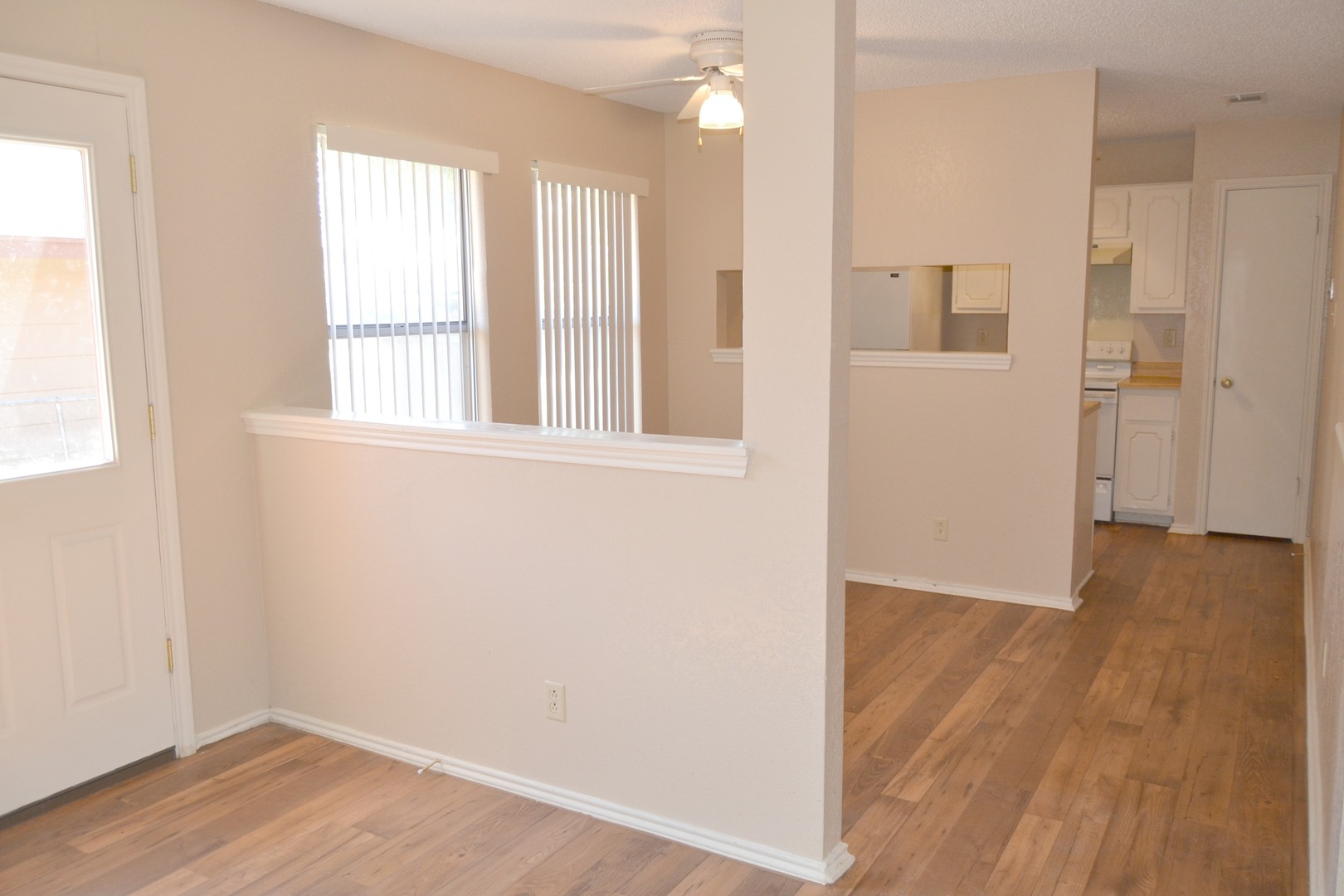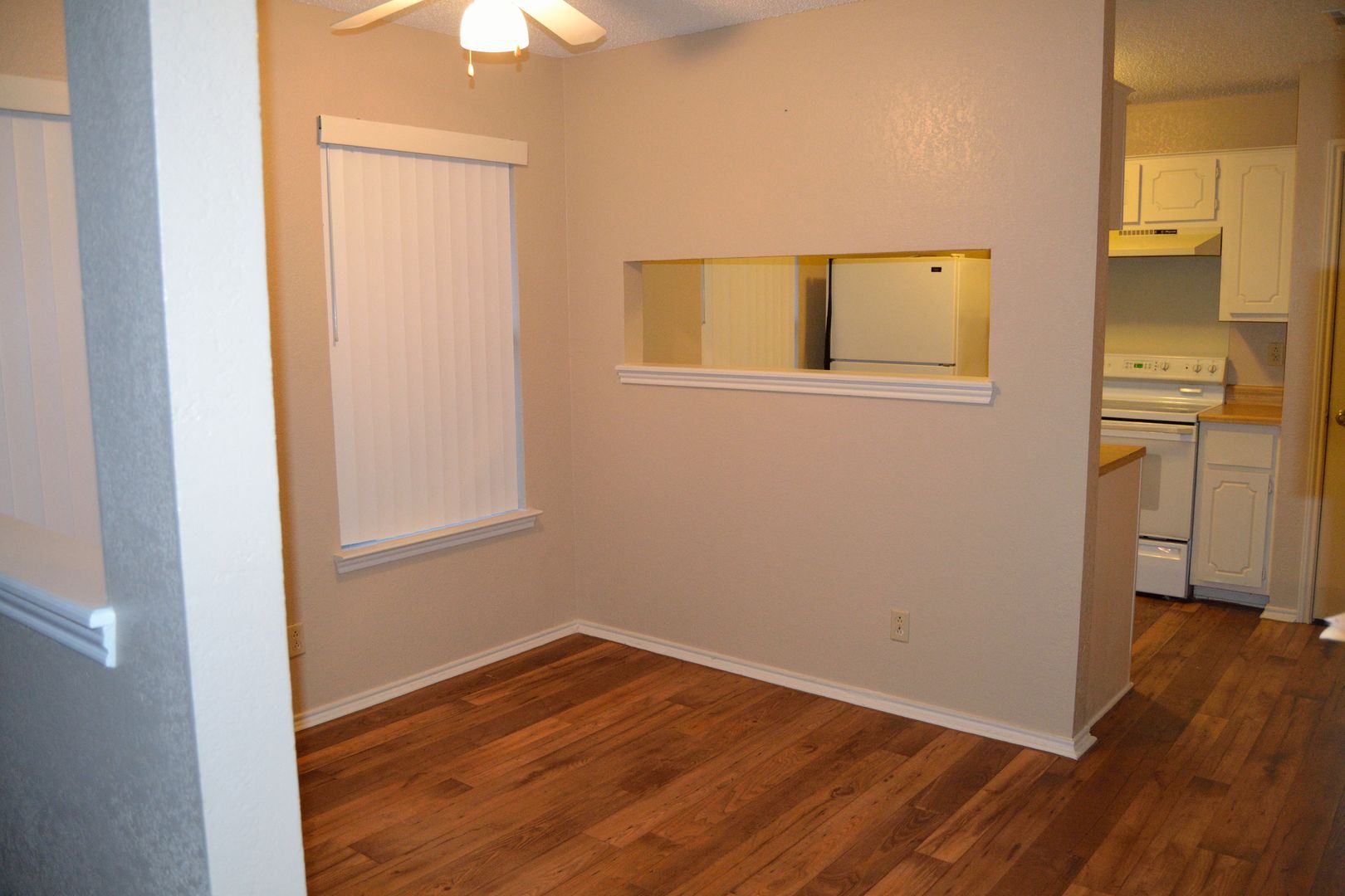 Available 02/10/2026. Clean two bedroom home with fireplace, built in microwave, and fenced yard.